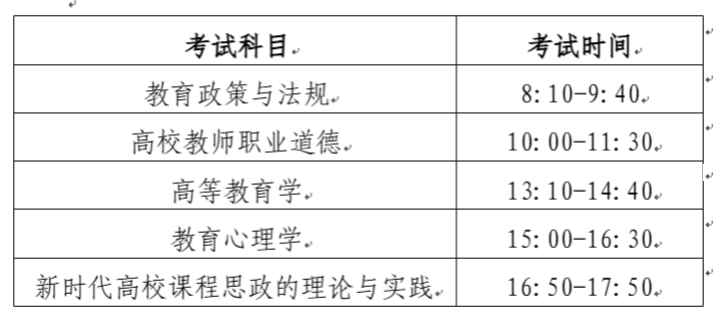 考试科目共5科,其中《教育政策与法规》《高校教师职业道德》《高等教育学》《教育心理学》每科考试时长为90分钟,《新时代高校课程思政的理论与实践》考试时长为60分钟。补考考生根据报考科目参加相应场次考试,其他安排及要求与正考考生一致。