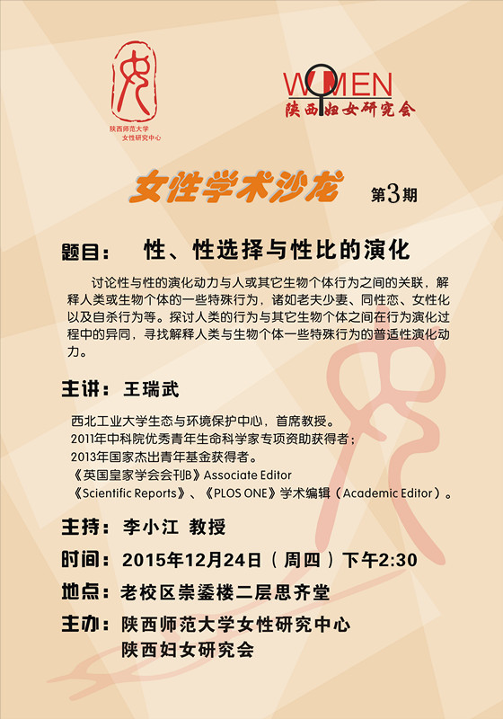 讲座题目:女性学术沙龙:性、性选择与性比的演化