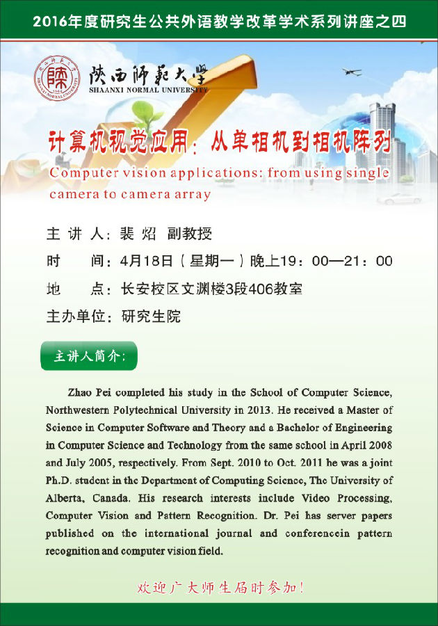 讲座题目:2016年度研究生公共外语教学改革学术系列讲座之四:计算机视觉应用:从单相机到相机阵列