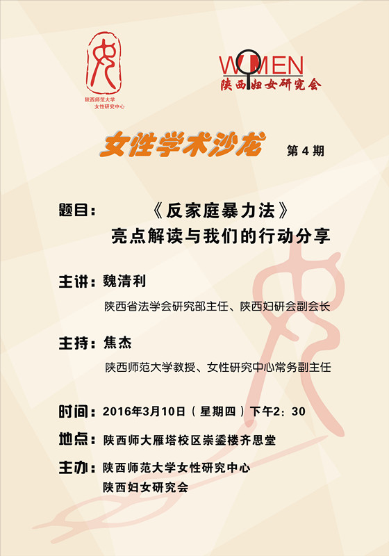 讲座题目:女性学术沙龙:《反家庭暴力法》亮点解读与我们的行动分享