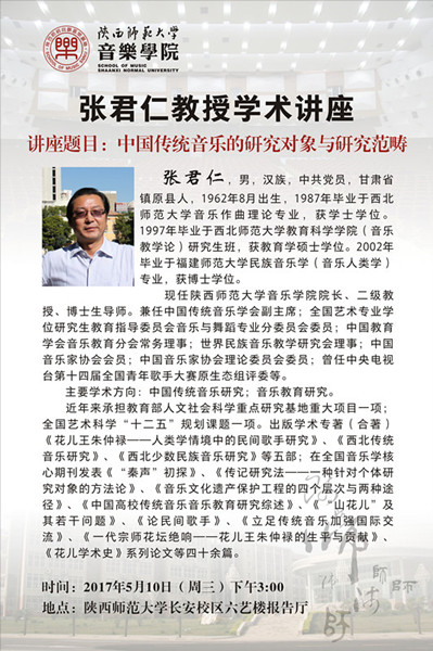 讲座人简介:张君仁,二级教授、博士生导师。现任陕西师范大学音乐学院院长,兼任中国传统音乐学会副主席;全国艺术专业学位研究生教育指导委员会音乐与舞蹈专业分委员会委员;中国教育学会音乐教育分会常务理事;世界民族音乐教学研究会理事;中国音乐家协会会员;中国音乐家协会理论委员会委员。主要学术方向:中国传统音乐研究;音乐教育研究。近年来承担教育部人文社会科学重点研究基地重大项目一项;全国艺术科学“十二五”规划课题一项。出版学术专著五部;在全国音乐学核心期刊发表学术论文四十余篇。