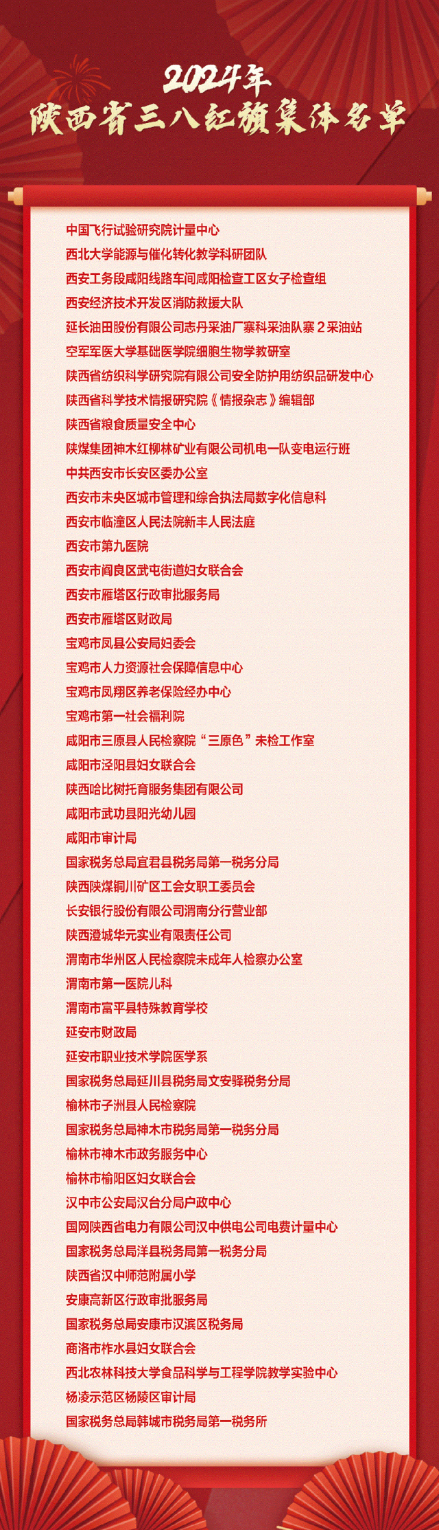 为表彰先进、树立榜样,进一步引领和激励广大妇女跟党奋进新征程,巾帼建功新时代,陕西省妇联决定,授予王金玮等10人陕西省三八红旗手标兵称号,授予王红玲等90人陕西省三八红旗手称号,授予中国飞行试验研究院计量中心等50个集体陕西省三八红旗集体称号。
