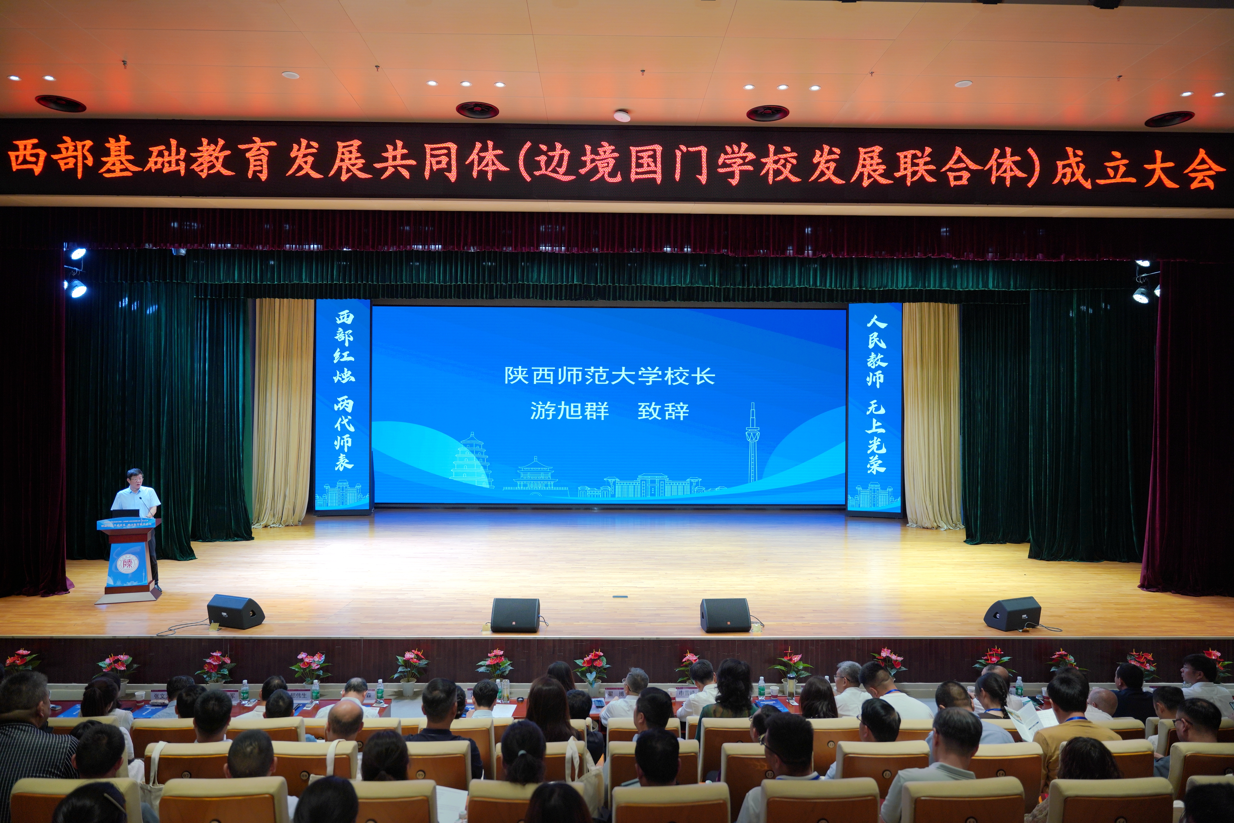 师大新闻网讯6月29日上午,西部基础教育教师发展论坛暨西部基础教育发展共同体(边境国门学校发展联合体)成立大会在我校附属小学召开。会议发布了《西部基础教育发展共同体(边境国门学校发展联合体)宣言》,公布了共同体理事会成员单位名单。中国教育学会常务副会长翟博出席大会并讲话,陕西省教育厅副厅长申雪峰、我校校长游旭群分别致辞,共同体学校参会代表、边境国门学校校长代表、观摩交流学校代表共500余人参会。大会由副校长陈新兵主持。