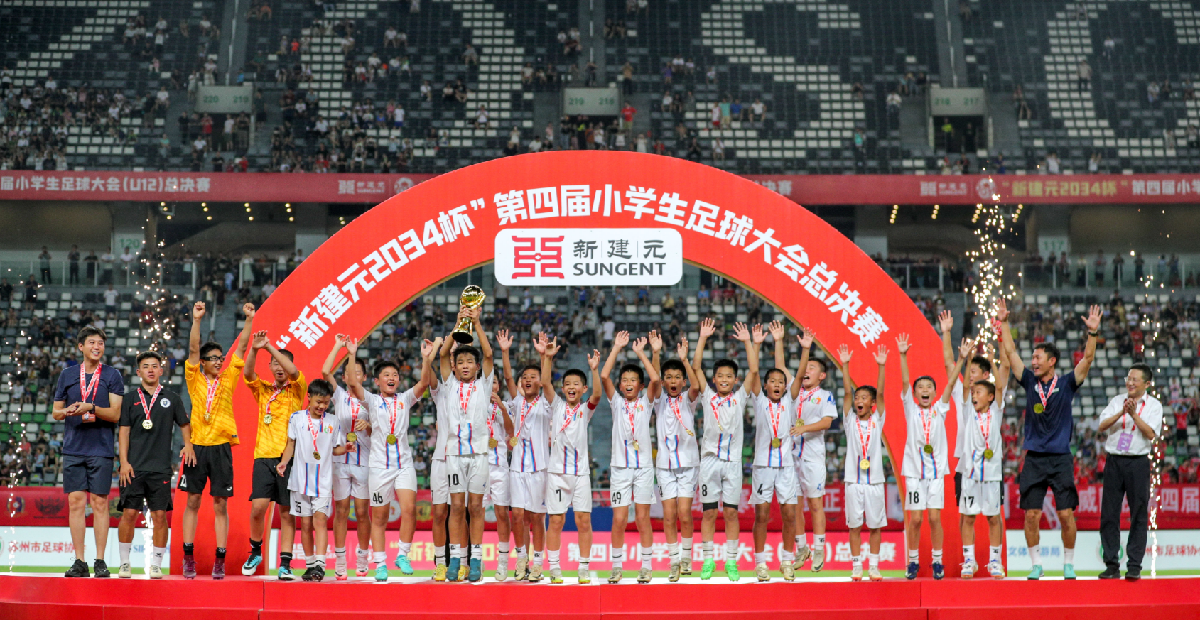 师大新闻网讯7月13日至20日,“2034杯”第四届小学生足球大会(U12)决赛在苏州奥体中心举行,来自全国的88支球队晋级决赛。我校附属小学足球队7战7胜,勇夺决赛冠军。崔庭旭、郭辰远双双获得最佳球员。