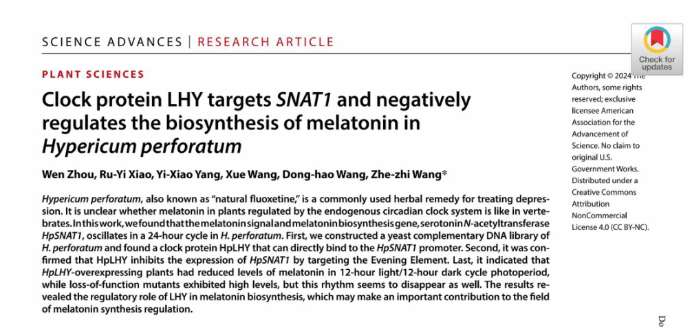 师大新闻网讯贯叶连翘(Hypericum perforatumm)被誉为“天然氟西汀”,是国际医药市场上最重要的抗抑郁植物制剂原料。褪黑素在贯叶连翘中的含量呈现节律性变化,但与动物中昼低夜高的规律模式不同,贯叶连翘褪黑素的积累量在白天达到峰值,尚不清楚植物内源生物钟系统是否与脊椎动物类似参与调节褪黑素的生物合成。9月18日,我校生命科学学院王喆之教授和周文副研究员团队在《科学进展》(Science Advances)期刊发表题为“生物钟蛋白LHY以SNAT1为靶点,负调控贯叶连翘中褪黑素的生物合成”(Clock protein LHY targets SNAT1 and negatively regulates the biosynthesis of melatonin in Hypericum perforatum)的研究论文。