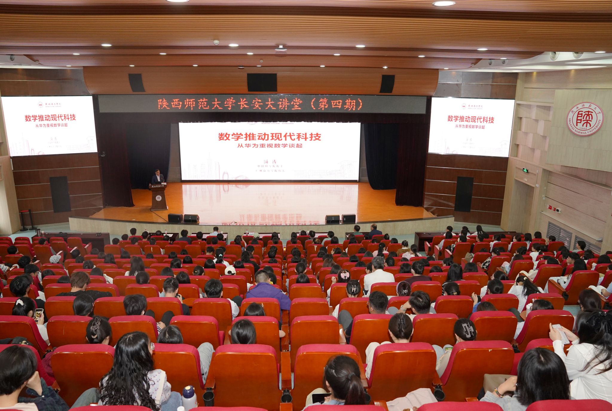 师大新闻网讯 5月8日下午,我校“长安大讲堂”(第四期)在新勇学生活动中心学生剧场举行。论坛邀请中国科学院院士汤涛教授作题为“数学推动现代科技发展”的主题报告。副校长王云博主持报告会。