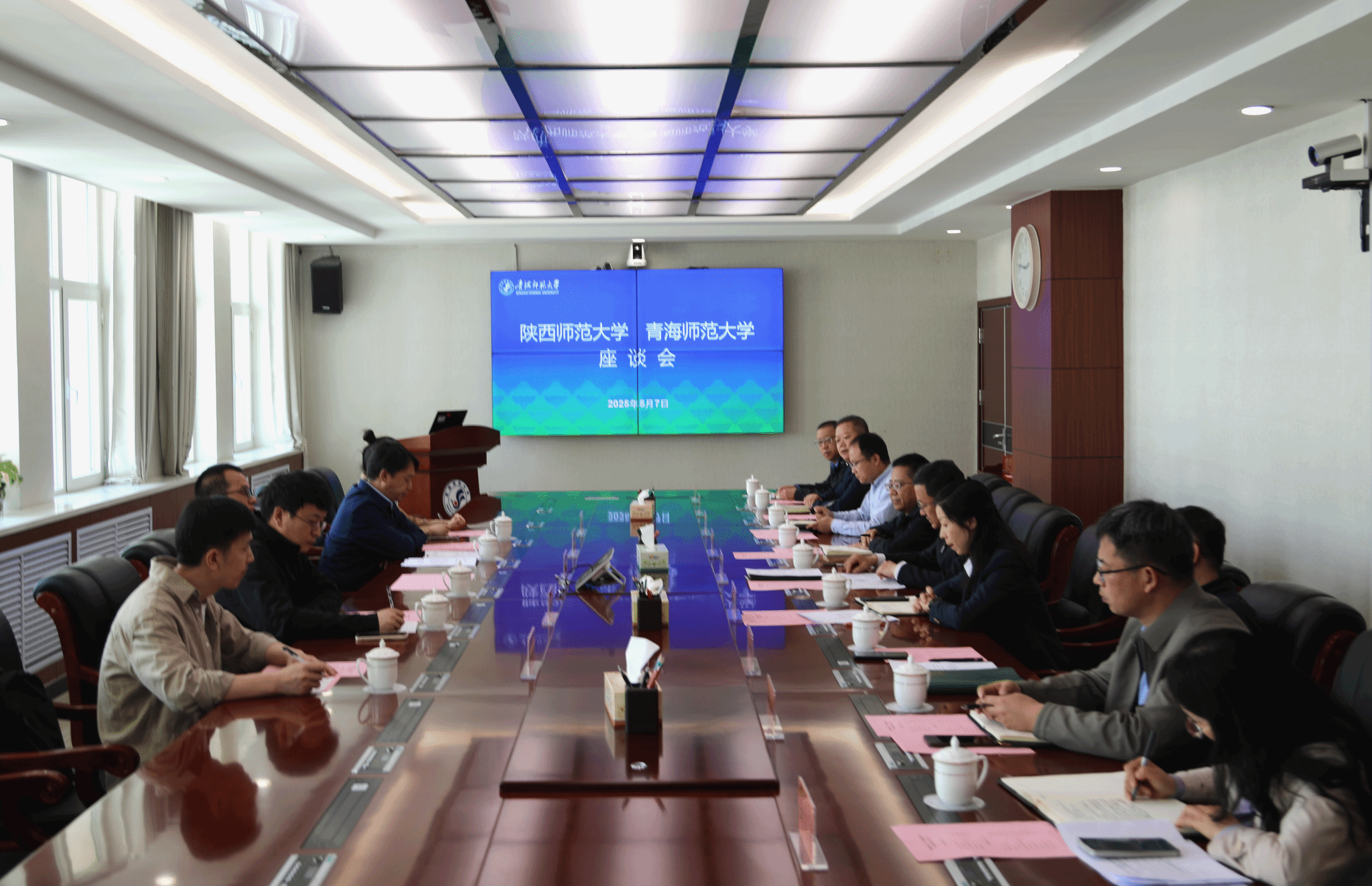 7日下午,调研组走访青海师范大学,与青海师范大学党委书记毛学荣、相关职能部门负责人及校友代表座谈。毛学荣代表青海师范大学向调研组表示欢迎,对我校18年来的对口支援表示感谢。石峰表示,陕西师范大学将持续同青海师范大学巩固友谊、深化合作,共同提升办学水平和服务基础教育能力,服务国家发展战略,履行师范大学使命担当。双方从师范教育协同提质、高层次人才教育引进、人工智能赋能教师教育、科研项目申报等方面展开充分交流。