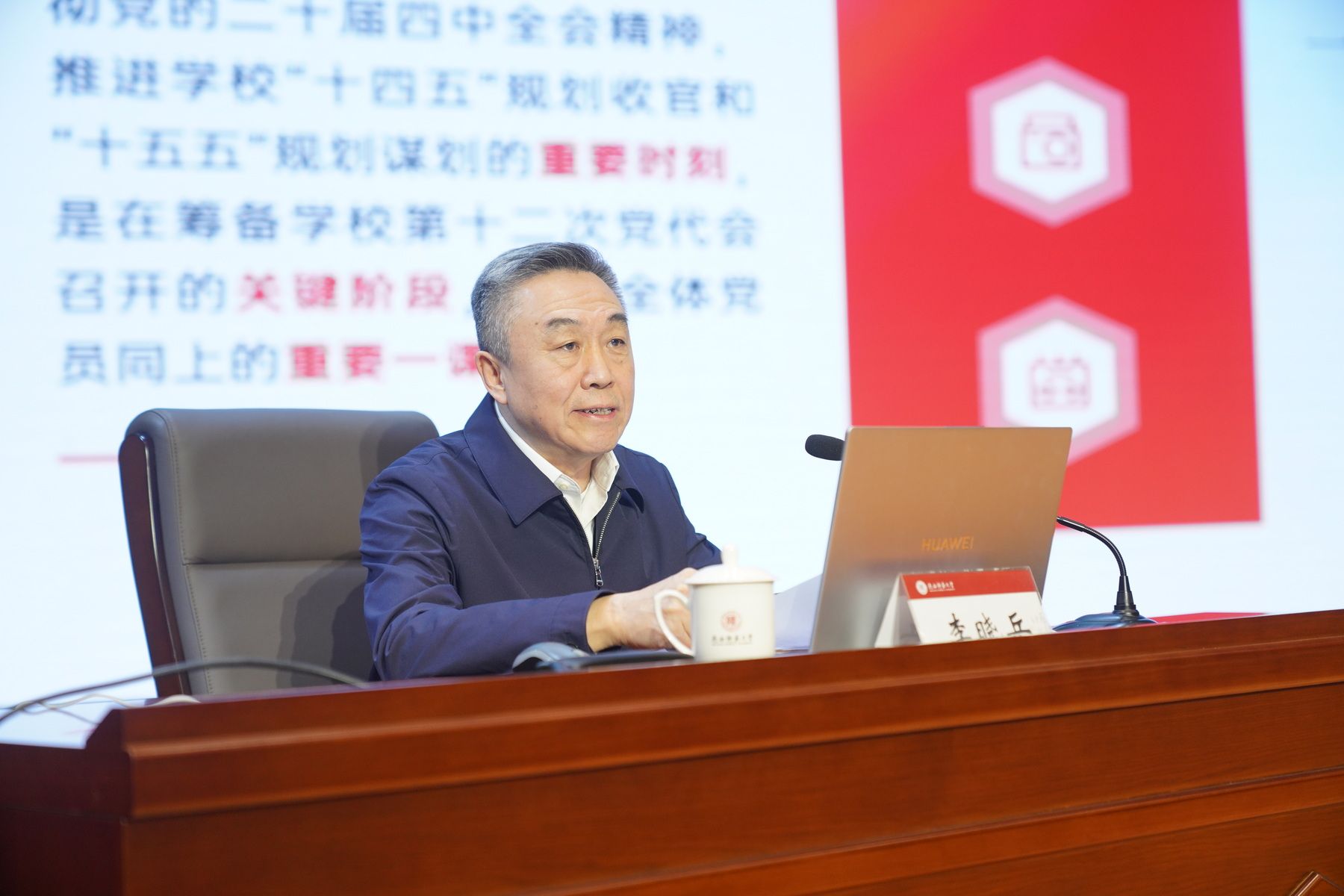 李晓兵在讲话中表示,此次大课是在学校深入学习贯彻党的二十届四中全会精神,推进“十四五”规划收官和“十五五”规划谋划,筹备学校第十二次党代会召开的关键阶段组织的重要一课,具有鲜明的政治引领性、战略指导性和实践针对性。他传达了党的二十届四中全会精神,强调全体党员干部要深学细悟强基,以全会精神铸魂固本,感悟全会的时代意义,把握全会的核心要义。他指出,学习好贯彻好全会精神是当前和今后一个时期全党全国的重大政治任务。学校各级党组织要扛起政治责任,分层分类抓学习。党委理论学习中心组带头领学,结合“第一议题”制度深研细悟;党支部以“三会一课”、主题党日为载体,开展全会精神研讨,推动入脑入心。党员要做好表率,先学一步、学深一层。通过“关键少数”示范引领,带动“绝大多数”跟进落实,形成全员奋进的生动局面。李晓兵简要回顾了学校“十四五”期间取得的成就,强调要知行合一促发展,深刻把握学校“十四五”成就的历史意义,坚定事业发展的信心决心,深刻领会“十五五”的战略定位,锚定事业发展的目标方向,以高质量党代会为引领,推动全会精神落地见效,在服务教育强国建设的征程中展现陕师担当。