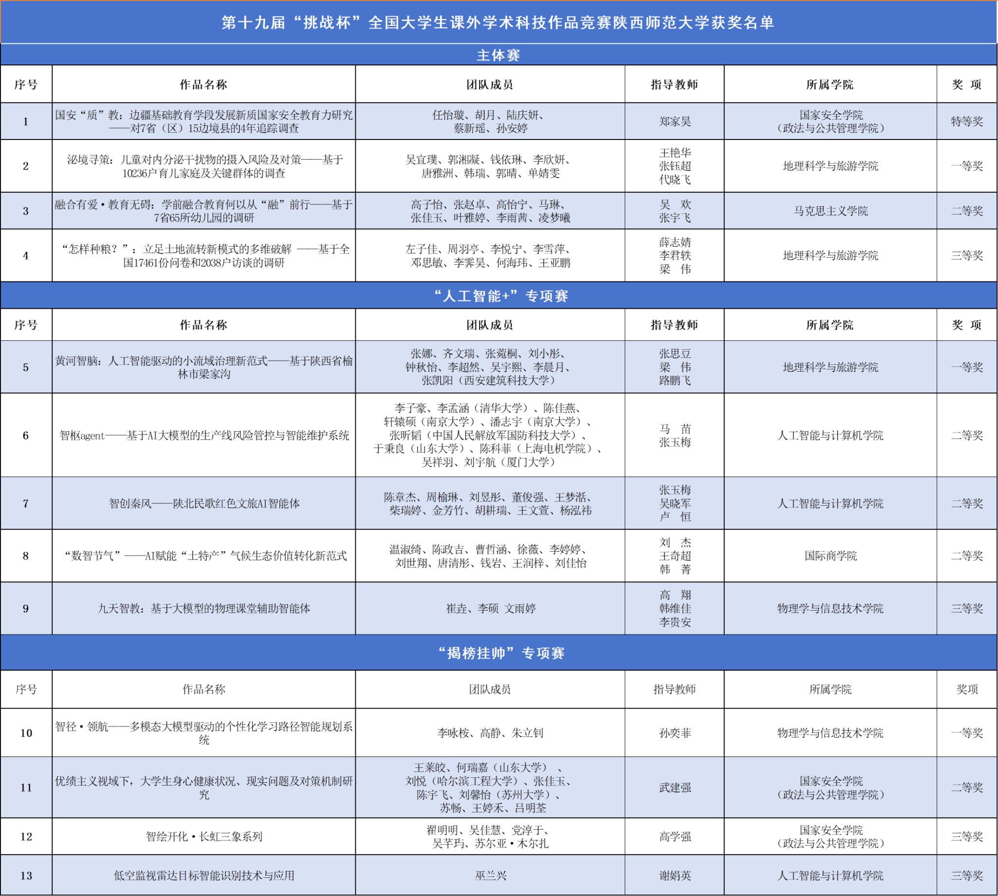 师大新闻网讯 10月31日至11月3日,第十九届“挑战杯”全国大学生课外学术科技作品竞赛终审决赛在南京大学举行。我校在主体赛斩获特等奖1项(全省2项),实现主体赛与“人工智能+”“揭榜挂帅”两大专项赛获奖全覆盖,国家级获奖总数、一等奖以上获奖数均创历史新高。
