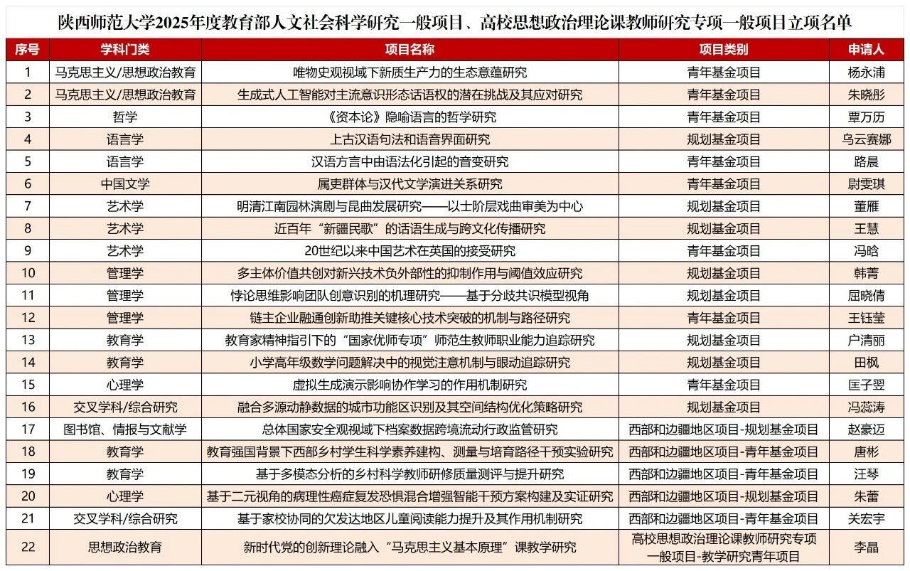 师大新闻网讯 近日,教育部社会科学司正式公布2025年度教育部人文社会科学研究一般项目的立项结果。我校共获批立项22项,立项数量位列全国第8位。