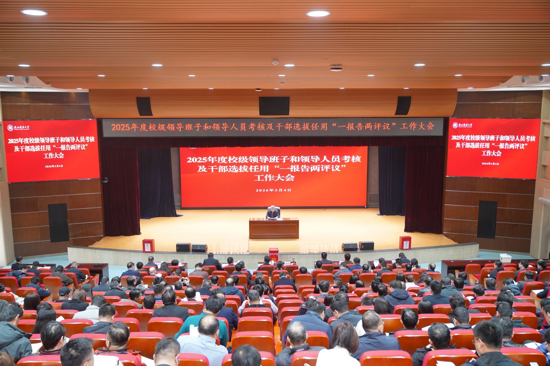 师大新闻网讯 3月4日,我校召开2025年度校级领导班子和领导人员考核及干部选拔任用“一报告两评议”工作大会。学校领导班子成员、党委常委、校长助理,教学科研单位和党政职能部门处级干部,直附属单位主要负责人,民主党派负责人、教师及学生等各方面代表参加了会议。大会由党委书记李晓兵主持。